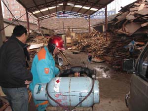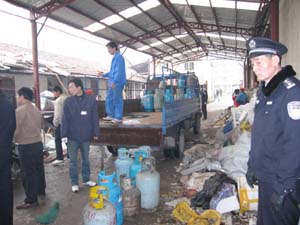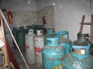 新春佳节即将到来,燃气行业管理部门进一步加大了打黑力度,2007年2月9日上午,燃气处执法人员会同市公安局、市公用监察大队开展了联合执法行动,着重对河西清凉门大街和所街等地区的几处“黑气”点进行了一次突击检查。在清凉门大街46号的一处黑气点检查时,刚好发现一个穿着百江工作服的“送气工”,还口口声声说是汉中门供应站的配送员,执法人员立即通知百江的站点负责人来现场确认,经核实,该名送气工早在三年前就因违规被百江辞退,而其却没有将工作服交回,仍然假借百江的名义给用户送气,执法人员当场收缴了他用摩托车运送的3瓶液化气。而打开这个黑气点的瓶库,令执法人员惊讶,在不足20平方米的简易房内,除了堆放的家具以外,还摆放了64只大大小小的液化气钢瓶,其中50公斤钢瓶就有16只,瓶库内电器不防爆,木质的门窗紧闭,瓶库的门前,堆满了废旧的木材,执法人员当即 收缴了瓶库内的全部钢瓶,消除了这一地区的重大安全隐患。