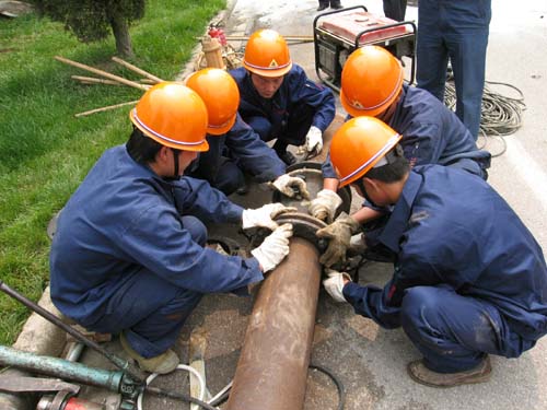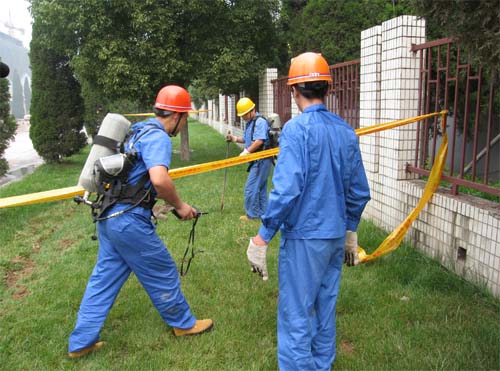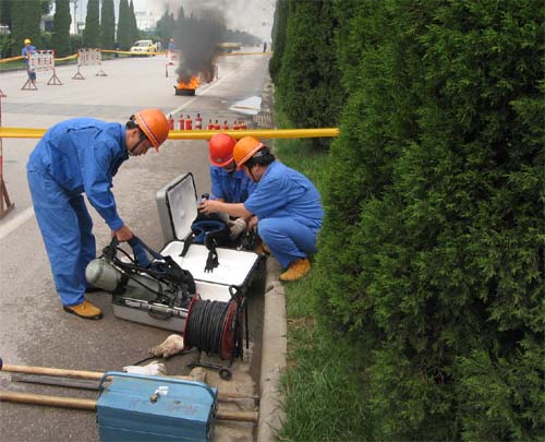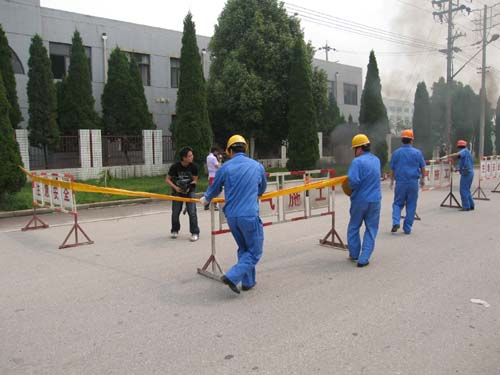 上午9:30,演习组织单位南京市燃气管理处人员及有关观摩人员即到达指定地点,工作人员随即开始布置模拟事故现场:在演习区域的燃气管道沿线滴洒燃气加臭剂,并在特定容器中放置混合好的汽柴油,一切布置停当,9:55本次演习总指挥燃气管理处张兆福处长一声开始令下,负责报警人员便拨通了江宁煤气集团公司的报修电话,报告了“事故”地点和情况,然后点燃准备好的汽柴油,顿时,火光和浓烟拔地而起。现场立即进入了演习状态,考核人员开始记时,10:04江宁煤气集团公司的第一辆黄色抢修车在呼啸的警笛声中到达现场。接着抢修人员立即在拉起了警戒线,安排人员在外围疏散行人和车辆,并按程序向公司领导作了汇报,在公司分管领导到达后立即成立了现场事故处理小组,初步估计了事故等级,启动相应预案,并分组实施事故处置:一部分人进行查漏,寻找“漏气点”,另一部分人员到“事故”地段两头关闭阀门,先“关闭”了上游阀门,同时不断向上级领导和有关部门报告“事故”处置状况。在找到“漏气点”后,待下游阀门处压力低于500~1000Pa时,“关闭”下游阀门,燃烧的“大火”开始变小,最终被扑灭,于是进入抢修程序,最后在10:30时完成了整个“抢修”,演习结束。