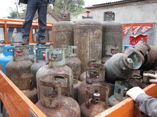 4月9日上午,南京燃管部门与公安、新闻媒体等单位联合行动,依法打击取缔我市城北地区的3个隐藏较深的“黑气”经营点,在钟埠路附近1个小巷内,执法人员进入1间出租屋,发现1个不足10平方米小屋内既当卧室,又当厨房,在散发着浓浓液化气味的屋内还堆满了液化气钢瓶,一旦泄漏达到爆炸浓度遇到明火很容易发生爆燃,后果不堪设想,屋里放着倒气用的导气管和台秤,以及假冒的百江液化气公司钢瓶塑封套。在检查人员检查时,旁边30 米外另1黑气经营户开着面包车夺路而逃,执法人员在他那间瓶库内搜出了44只大大小小的钢瓶,其中很多是报废钢瓶。在中央北路,执法人员查获一家假冒百江、华润液化气的黑气窝点,店主还慌称是从外面买来的,可是打开门一看,里面竟然也堆了十几只百江、华润公司的钢瓶,和数百只假冒塑封套。此次联合执法共取缔3个黑气点,依法先行保存液化气钢瓶73只,及时消除了这一地区的3个重大安全隐患,同时也避免更多的用户利益受损。
