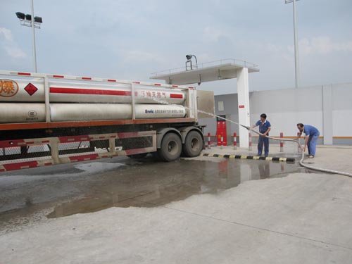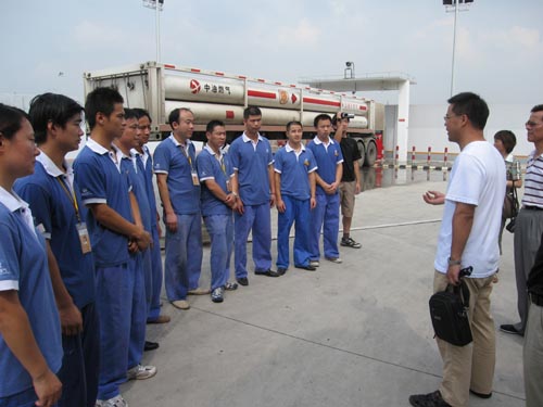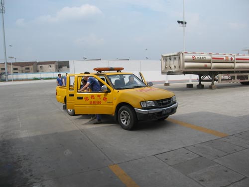 下午2:50分,当头的太阳火辣辣地照在演习举办者和加气站工作人员身上,不一会豆大的汗珠就从脸上淌下来,这时,只听“吱――”的气流声音突然响起,加气站巡检人员发现险情后立即跑向站长报告,“撬车卸气管脱落,天然气泄漏了”。站长立即向演习指挥长报告,发生了严重天然气泄漏事故。指挥长一声令下,“启动应急预案”,站内工作人员立即按预案制定的各自岗位,关阀的关阀,停机的停机,加气作业立即停止,同时站长迅即电话向公司报告紧急情况。5分钟不到,在外围巡查的抢修车辆呼啸着开进出事场区,只见专职抢修队员带着工具奔跑向事故地点,警戒、查漏、抢修、提着灭火器监护、打开消防水驱散集聚天然气,10分钟不到,事故得到控制,“吱、吱――”的啸叫声渐渐变小,最终消失。进一步检查现场后,抢修人员向演习指挥报告情况,演习指挥在确认无漏气及安全的情况下宣布演习结束,恢复生产。