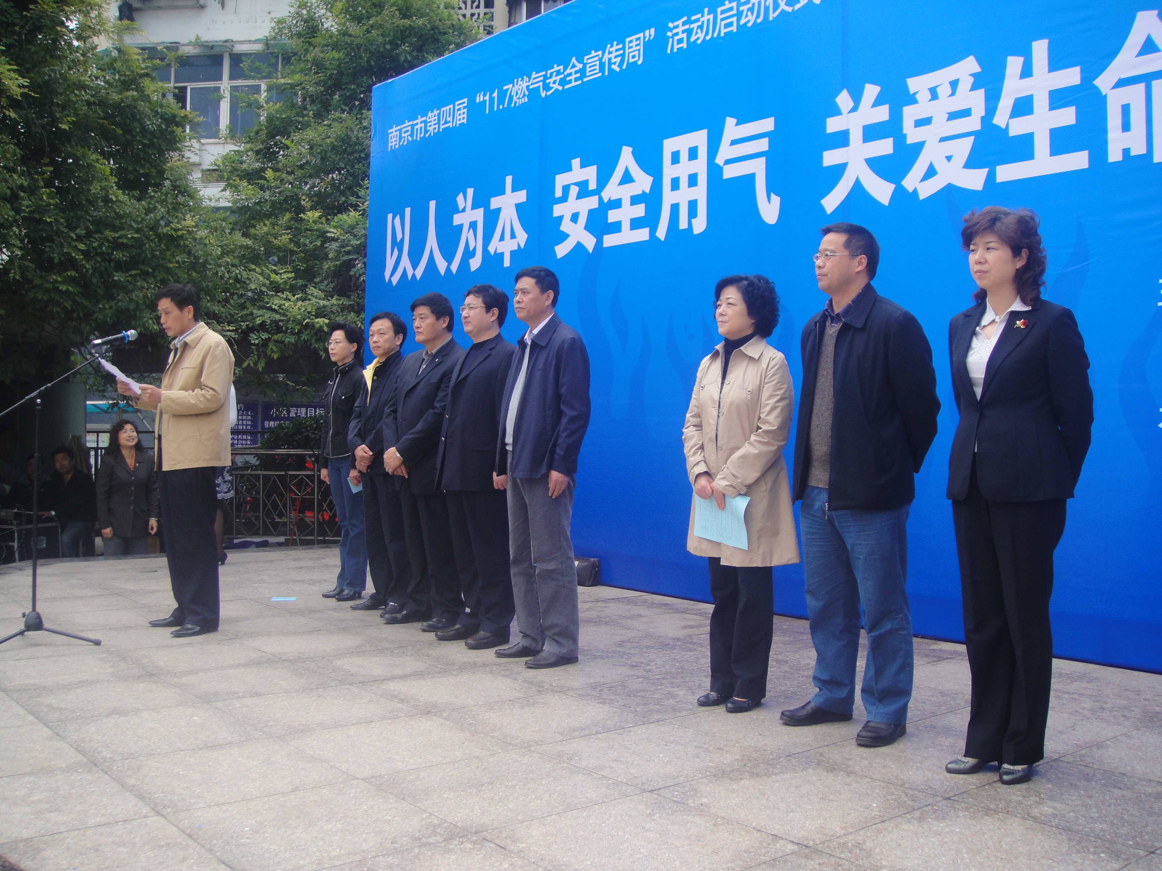 2009年11月7日建邺区南湖市民广场锣鼓喧天、人头攒动。由南京市燃气管理处和建邺区安监局承办的第四届“11.7燃气安全宣传周”启动仪式在这里举行。来自燃气行业的十多家企业、市政系统和燃气行业的行风监督员参加了仪式。出席启动仪式的领导同志和嘉宾有南京市市政公用局局长助理何金雪、宣教处处长王华、局办公室主任张玉英、南京市安全生产监督管理局副局长张斌杰、建邺区政府储俊副巡视员、南京市燃气管理处处长张兆福、书记金勇军、建邺区安监局局长刘永元、副局长庞广春等。