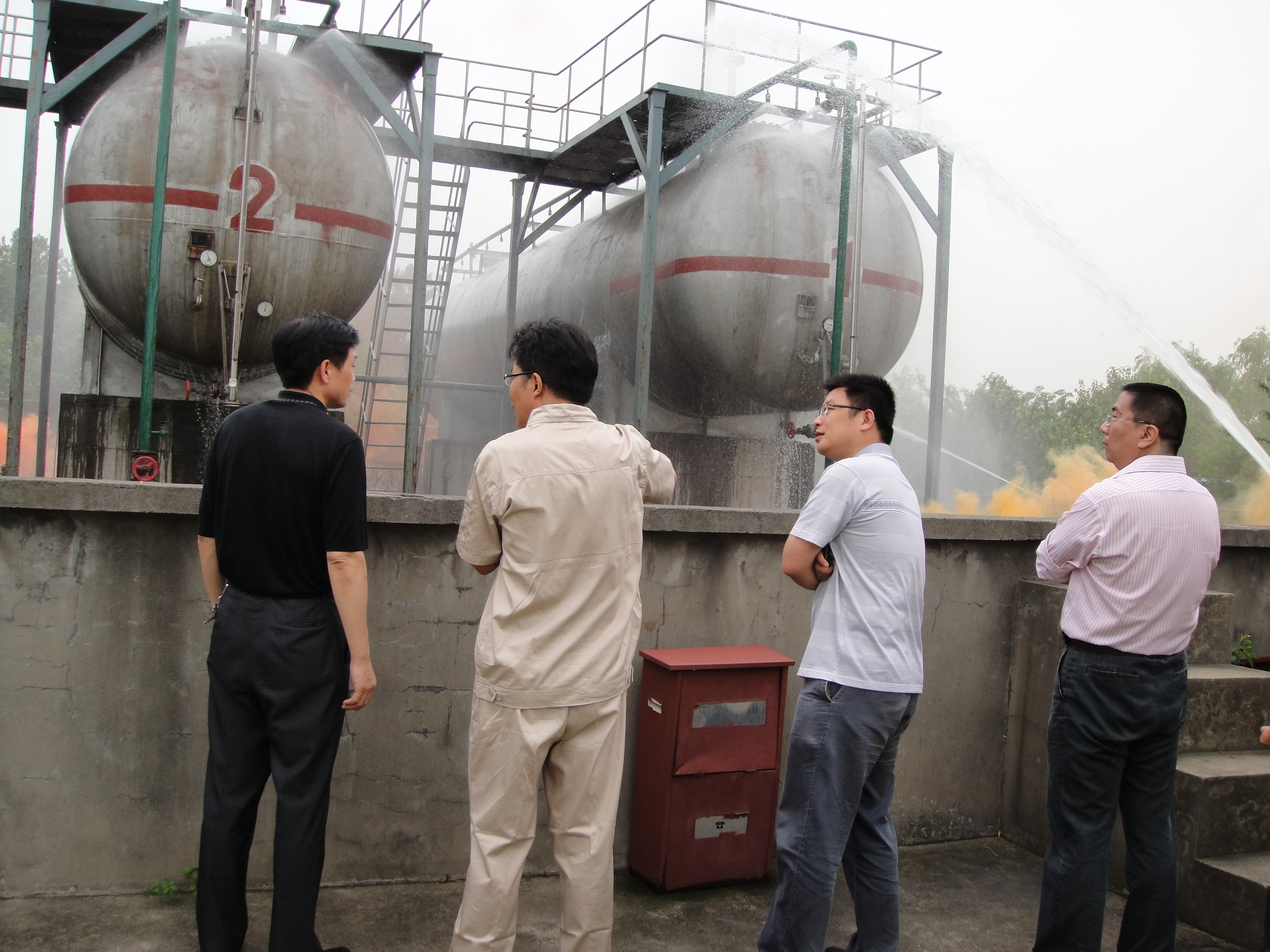 此次“灌场事故应急演练”的内容是:1号罐首阀门发生漏气。演练过程中,应急救援行动小组在“事故现场”按照事故应急处理预案流程,拉警戒线、喷射自来水过滤、检测漏气浓度、关闭阀门……各尽其职,有条不紊地进行。