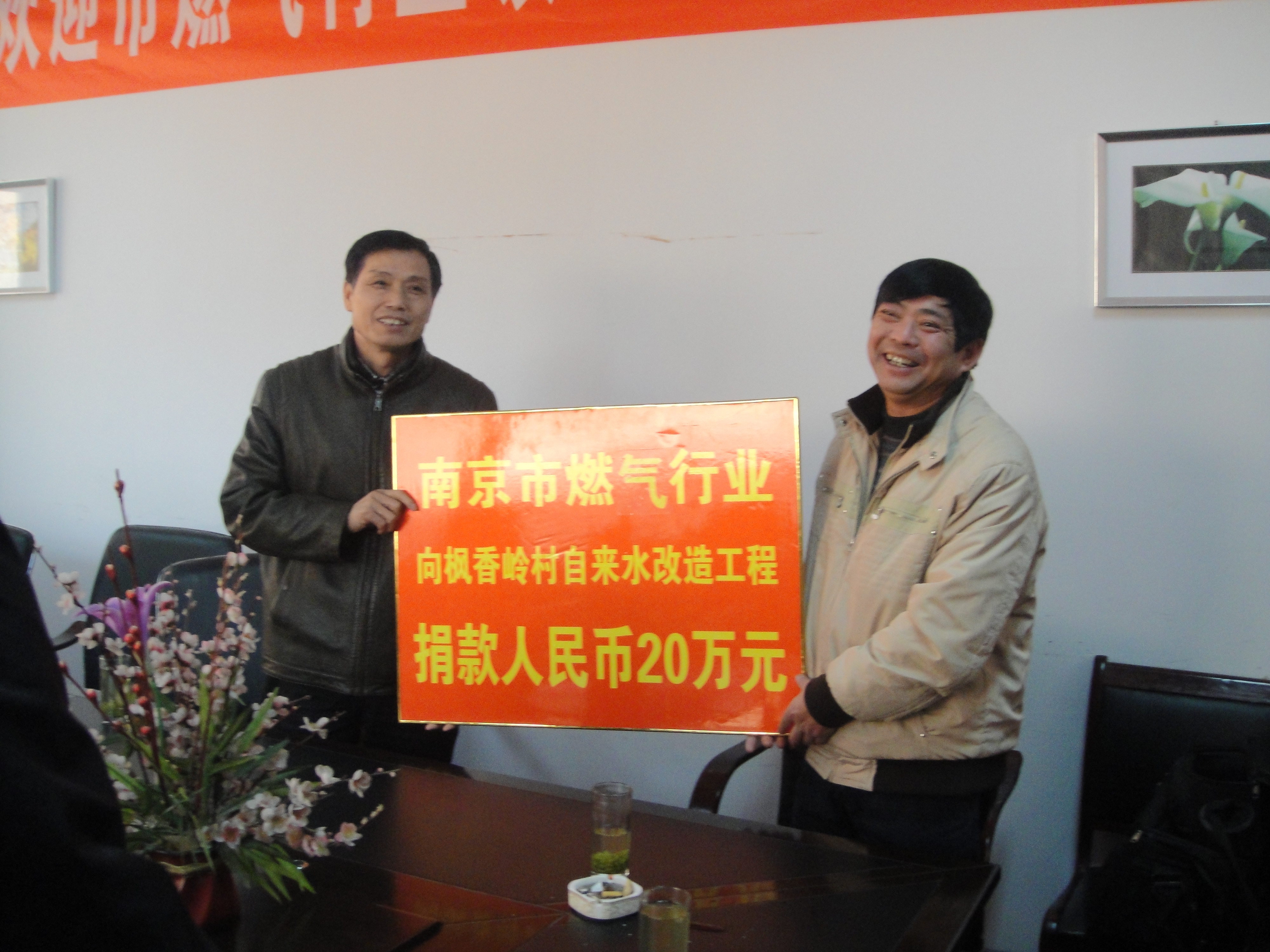 2011年12月14日,由市燃管处张兆福处长、夏军副处长带队,与市住建委宣教处丁昌华处长、南京港华、南京中燃、江宁华润、南京百江、南京南炼、扬子百江、南京蓝天等公司的相关领导以及市住建委新闻中心的媒体记者一同前往共建村溧水县枫香岭村,将二十万元捐款交到了村党总支曹孚顺书记手中,用于该村生态村建设项目中的自来水改造工程。