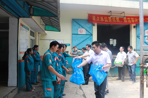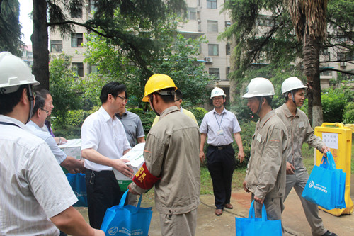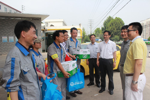 当慰问人员刚进南京百江岗子村供应站时,送气工王师傅刚刚送气归来,全身工作服已经湿透。陆燕飞处长为王师傅送上清凉饮料和防暑药品,并对王师傅在高温下坚持为市民送气上门的服务工作表示感谢。要求各企业一线工作人员在高温条件下工作时,一是要注意做好防暑降温工作,避免一线服务人员过度劳累,防止人员中暑;二是要加强对高温下运行的设施设备加强检查与维护,保证良好的运行状态,为青奥期间我市燃气安全与保供工作提供有力保障;三是各企业要加强对所有一线服务人员的教育,使一线服务人员牢牢树立“办好青奥我光荣”的主人翁意识,展现我市及燃气行业服务人员的良好风貌。