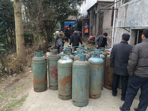 溧水区燃管办在日常巡查中,发现东屏镇有一处“黑气点”,规模较大,邀请我处协助对该“黑气点”进行查处。2014年12月19日,我处和溧水区燃管办执法人员前往现场发现违法人员在商户门前以倒灌的方法进行液化气销售,三轮车上装有5、6个实气瓶,地下室储存了30多只液化气钢瓶,稍有不慎就会引起爆炸。经查,该站点无任何相关审批手续,且未落实任何防火防爆措施,私自从事液化气充装、储存、运输、销售业务,执法人员当即向其讲述了问题的严重性、危害性和有关法律法规,先行保存燃气钢瓶56只。本次联合执法,不仅有效打击了违法经营行为,也对区燃管办工作人员进行了执法业务培训,规范提高了执法水平。