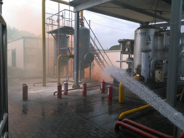 上午9点30分,新港加气站内设备区某处管道泄漏引发火灾,火势较大,浓烟滚滚,本次应急处置联动机制演练正式开始。演练模拟一名站内安全巡检员在新港站内设备区的某处管道发现火情,且火势正在迅速蔓延。巡检人员立即大声呼喊向站长汇报火情,同时用灭火器迅速灭火。站长接报后,根据现场情况,指示立即关闭站内所有放散阀、口,疏散人员,尽快利用消防设施扑救。在灭火过程中有人员受伤,站长发现现场火势无法控制,立即请求119火警及公司支援。港华公司接警后。启动4级应急响应,抢险组、医疗组立即入场处置,消防人员也随即入场救火。现场总指挥在了解情况后向安监、质监、燃管等部门汇报。经过紧张的处置,火情最终得到控制。最后,应急处置组人员检查站内各项生产设施,调查事故原因。本次应急演练耗时1小时余,整个演练过程紧促、连贯、真实,取得圆满成功。