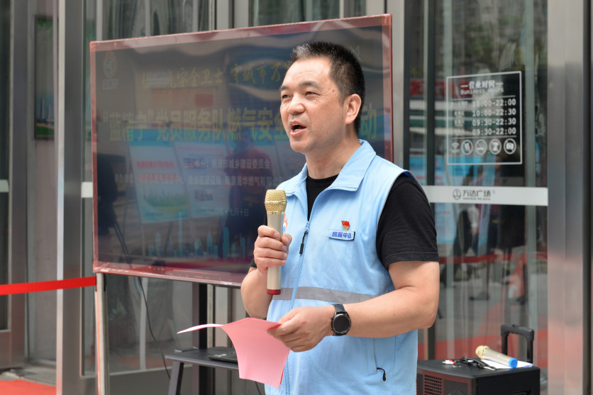 市燃服中心主任王根林在活动中致辞,他指出,“蓝精宁”是今年我市燃气行业新近推出的一个党建服务品牌。面对全国安全生产形势日趋严峻的挑战,我市燃气行业主动作为,积极响应省委组织部、省“两新”工委安全生产党员“三有三带头”号召,充分发挥党建引领作用,“蓝精宁”品牌正是在这样的背景中诞生的。目前全行业以该品牌为依托,组建了6支党员服务队伍,“蓝精宁”服务阵容已初具规模。他强调,今天的联合行动是“六个深入一线”的具体体现,全体队员要强化使命担当意识,提升履职尽责能力,切实发挥服务队实际作用,真正实现“以活动促工作、以活动促安全”的初衷。