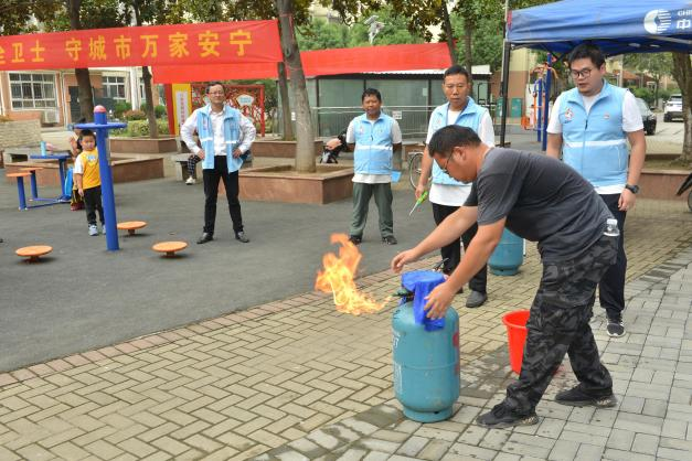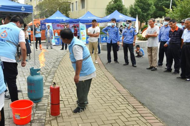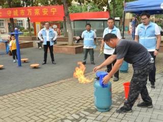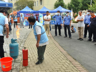 在活动现场一侧的独立安全区域内,有几名“蓝精宁”队员正组织对参加现场活动的小区居民、社区网格员等进行液化气钢瓶泄漏及着火的应急处理演示,邀请居民和网格员参与实操培训,针对居民和网格员提出的问题,开展现场答疑交流活动,将活动氛围带入高潮。此次活动内容丰富,形式多样,寓教于乐,受到小区居民的一致好评。