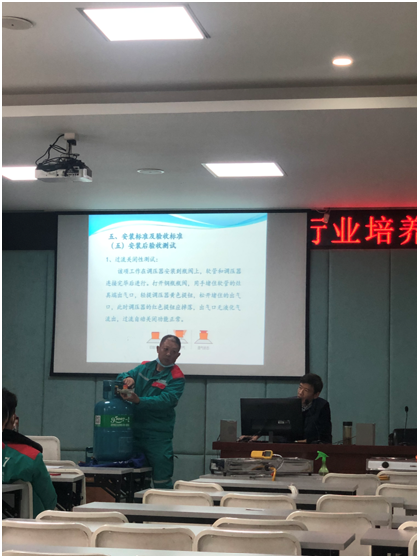 本次培训邀请了行业内两位具有扎实理论基础和丰富实操经验的老师进行授课,内容包括连接管和调压阀相关国家、行业标准解读,产品性能和使用说明,安装和验收流程的相关要求等,在理论知识讲解完毕后请部分企业派代表进行现场规范操作演示。此外,还安排智慧燃气平台工程师详细介绍安装验收后上传资料至平台的过程,确保每单工单信息准确可溯。